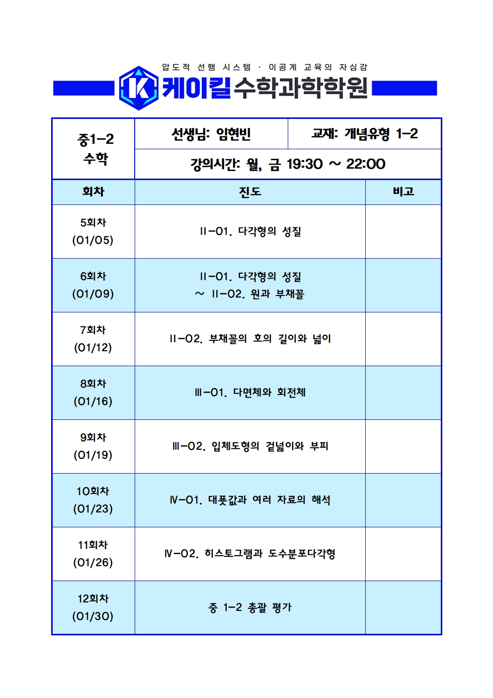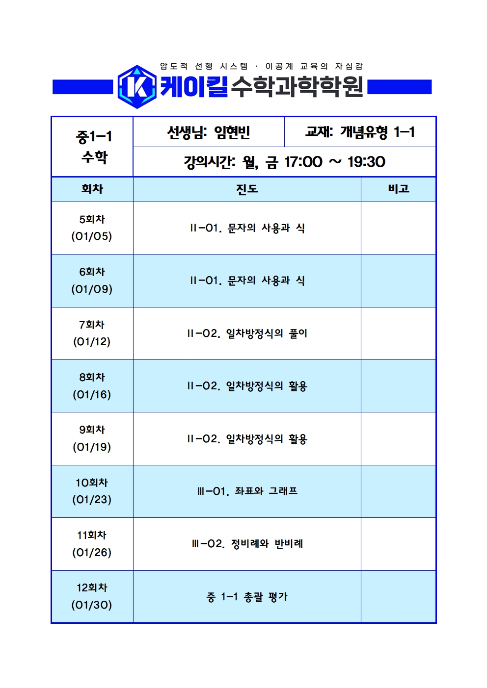 중등 1학년 시간표